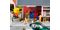 Великий, різнобарвний набір обладнання з 60 штабельованими коробками для напоїв, 40 коробками для пляшок, 160 окремими пляшками, шістьма піддонами, п'ятьма пивними бочками та двома візками для піддонів.